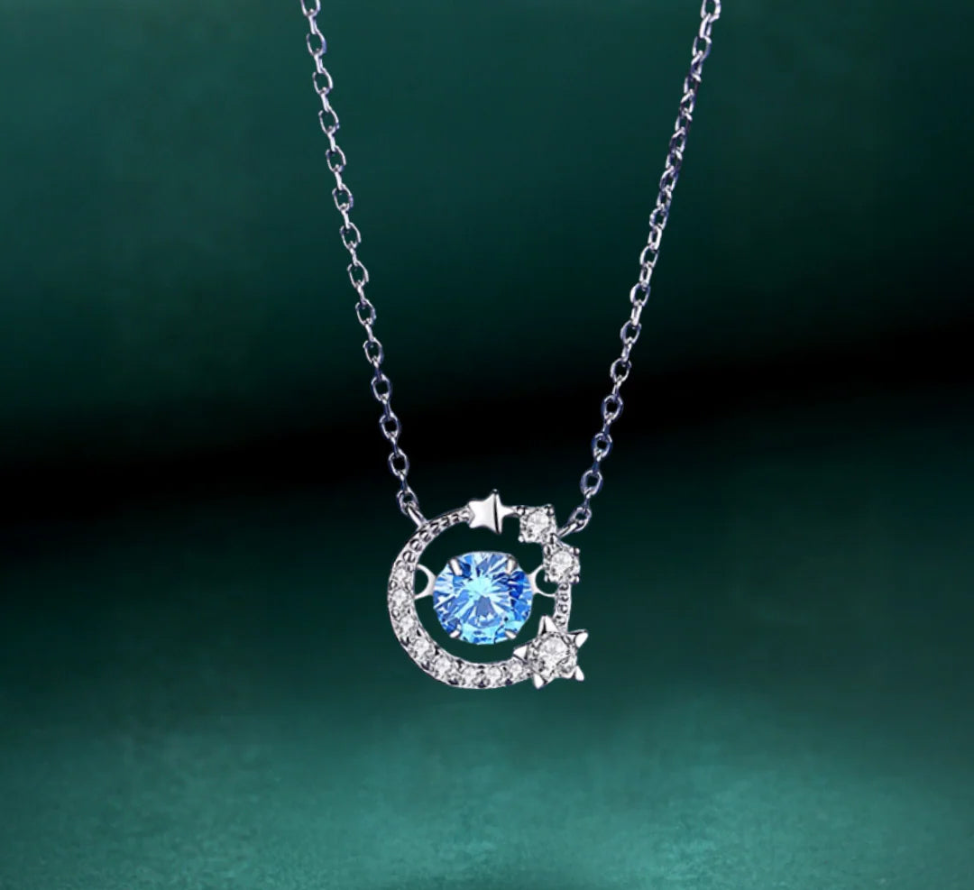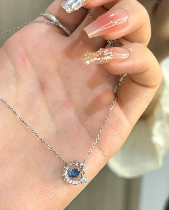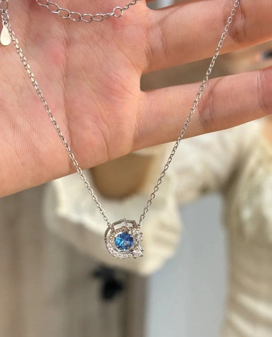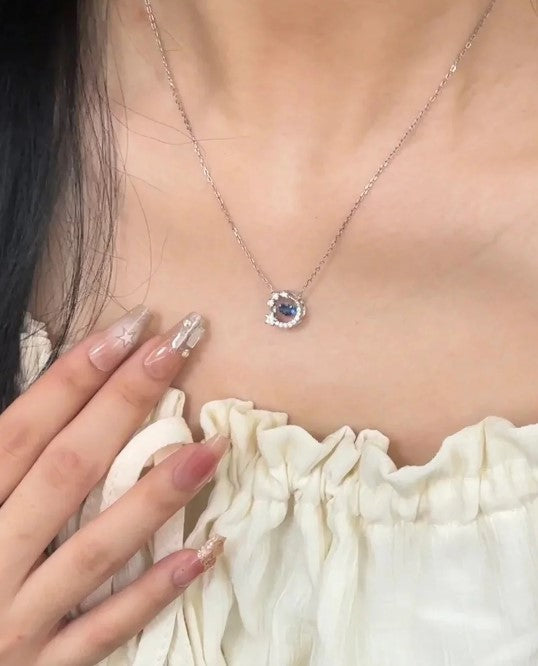 จี้ชิ้นนี้คือการผสมผสานอย่างลงตัวระหว่างความงามอันโรแมนติกและทันสมัย เปรียบเสมือนภาพกาแล็กซีขนาดจิ๋ว ตรงกลางจี้หินสีน้ำเงินทรงกลมโดดเด่นดุจดวงจันทร์หรือดาวเคราะห์ที่ส่องแสงระยิบระยับ แสงระยิบระยับจากจี้ดึงดูดทุกสายตา ให้ความรู้สึกราวกับต้องมนตร์และลึกลับ